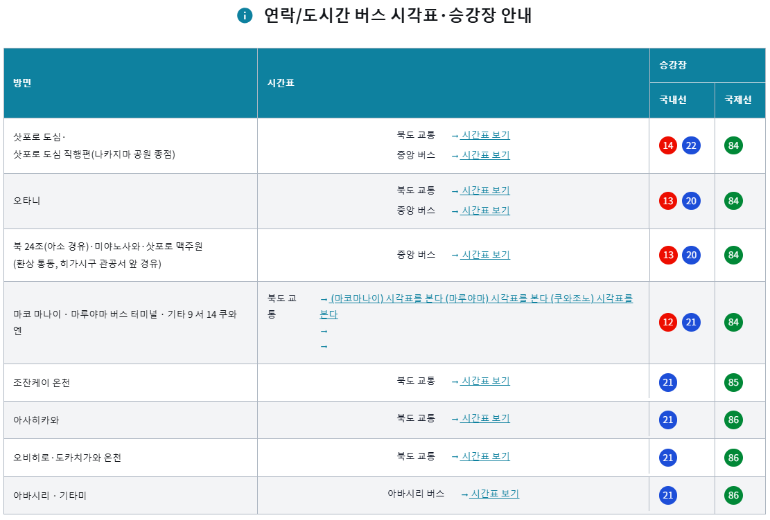 신치토세 공항 홈페이지에 있는 버스 편 사진입니다. 총 8편이 있고 국내선, 국제선을 순차적으로 들러 양쪽 터미널의 손님들이 이용할 수 있도록 하고 있어요. 삿포로 도심을 가는 버스들이 많네요. 그럼 하나씩 자세히 살펴보겠습니다.