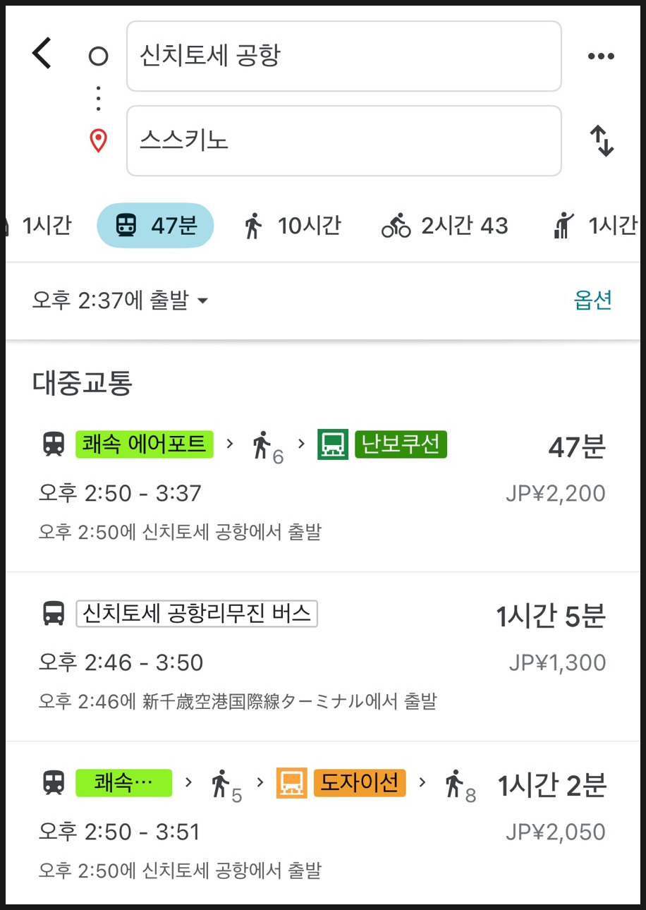 구글맵에 출발지 신치토세공항 도착지 스스키노역 넣어 검색해보니 신치토세공항에서 스스키노 가는 세가지 방법이 나오더라고요.