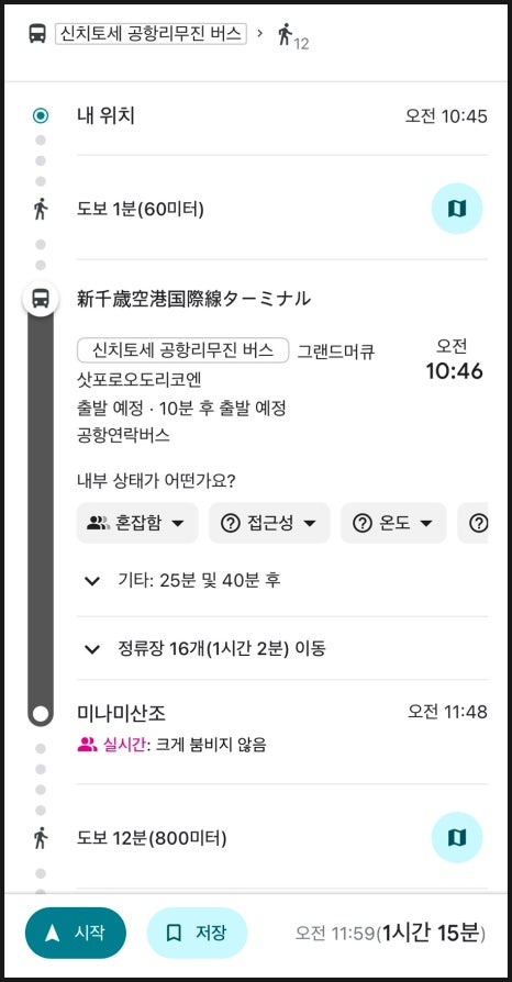 시간표는 구글맵에 거의 정확하게 나와있어요. 공항버스는 약 15분 간격으로 있으니 놓치셔도 괜찮습니다. 스스키노역 까지 가는데에 약 1시간 넘게 소요됩니다.
