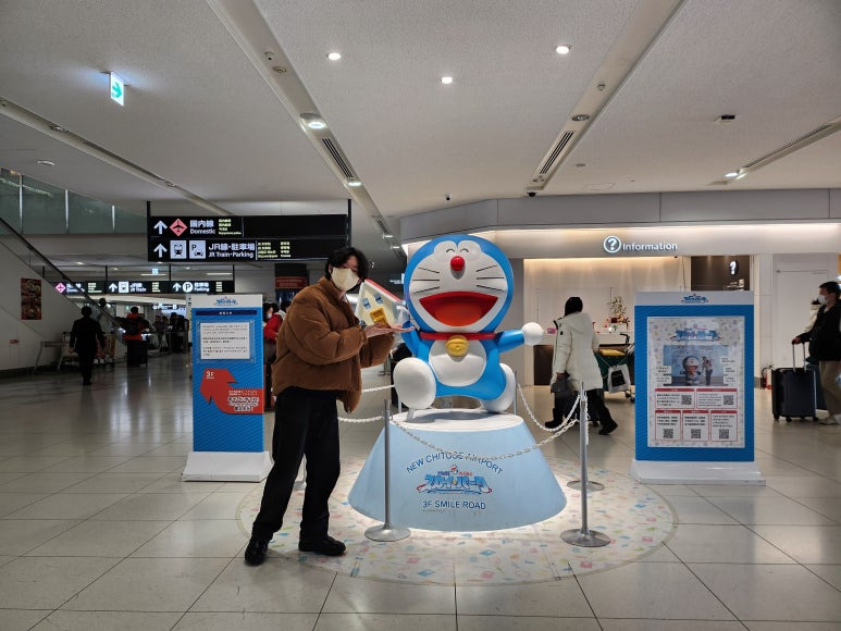 입국장에서 쭉 걸어 나오면 보이는 도라에몽! 도라에몽을 마주 보고 왼쪽으로 쭉 이동하면 됩니다. 이 도라에몽을 마주 보고 앞으로 직진하면 국내선인데 여기 2, 3층에 라멘 거리, 맛집, 유명한 디저트 가게, 기념품 매장이 몰려있습니다.