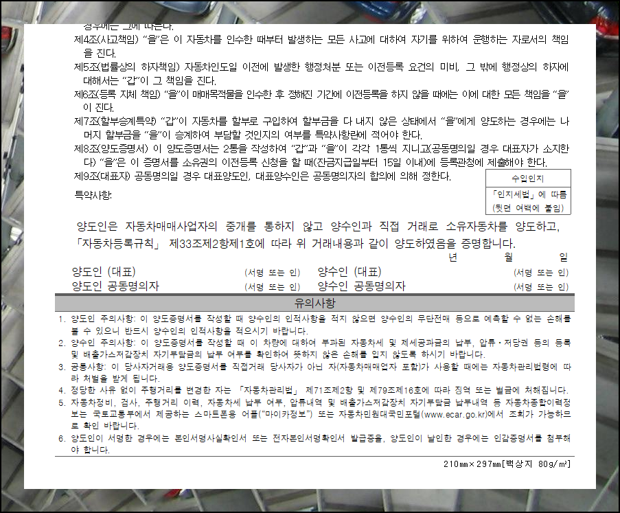 양도인의 경우에는 자동차 매도용으로 발급된 인감증명서 또는 본인서명사실확인서를 함께 제출하셔야 하며, 이를 통해 대리인이 정식으로 권한을 위임받았음을 증명할 수 있습니다. 이와 함께 양도인과 양수인이 함께 작성한 자동차 양도증명서를 준비하셔야 하며, 차량 정보와 거래 내용이 빠짐없이 기재되어야 하고 양측 서명이나 도장이 있어야 합니다.